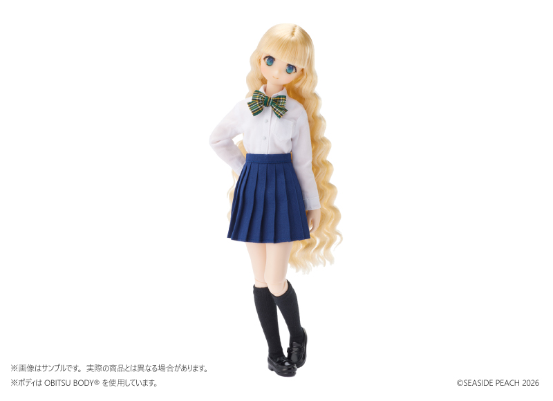 すずはオビツ24ボディを採用。ヘッドは入れ目仕様で、マリンブルーの8mmアイをセットしました。豊かに波打つブロンドのウェーブヘアは、リトルファクトリーの熟練職人によるもの! Dollybirdだけの特別なモデルです。